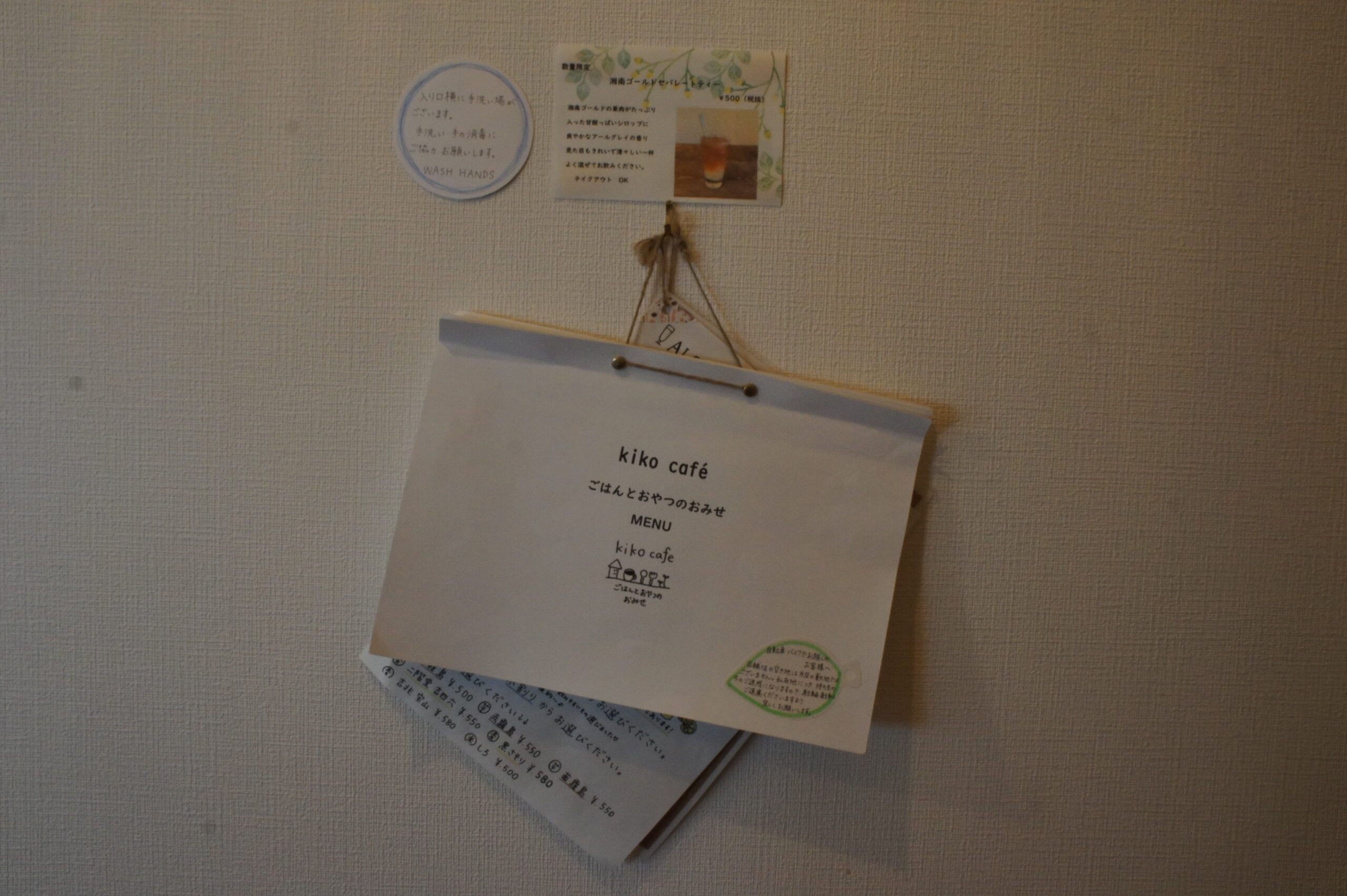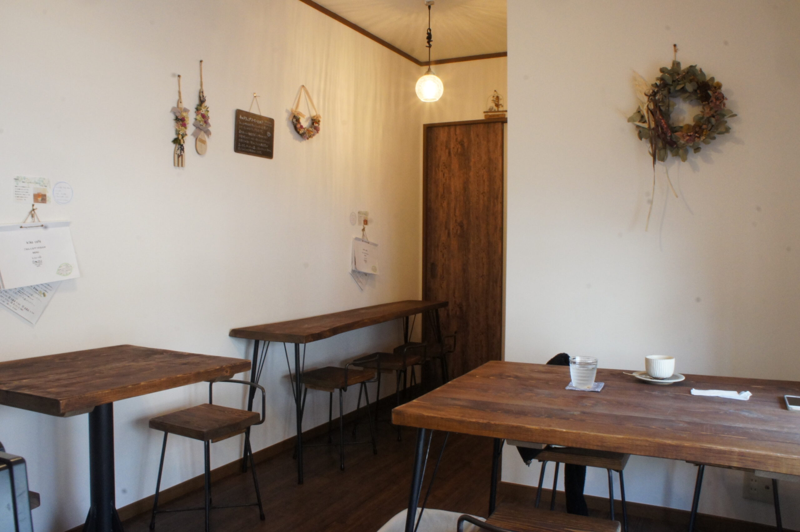ドアを開くと店内には 木のぬくもりを感じる木目調のテーブルとイスが客を待ち構えています。落ち着いた店内と、優しい手描きテイストなメニュー表。インテリアや小物、食器やお盆それぞれにこだわりを感じる店内。